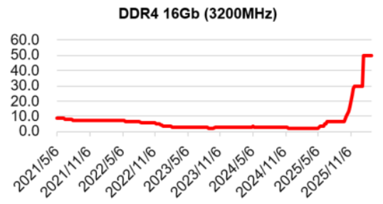 存储芯片成为传导链条中的关键环节。2025年下半年以来,全球存储市场迎来罕见普涨,DRAM和NAND价格创下2016年以来新高。截至2026年1月,DRAM(DDR4 8Gb)合约平均价格比2025年9月上涨约83%,NAND闪存(128Gb)涨幅近1.5倍。