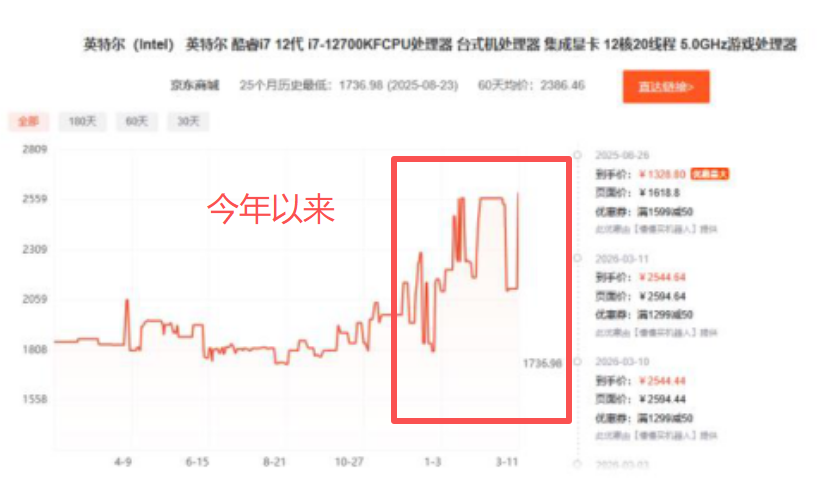 CPU市场也未能幸免。2025年第三季度开始,英特尔和AMD上调消费级CPU价格,主流型号涨幅7%-10%。2026年初,服务器CPU启动“补涨”,整体涨幅4%-7%,其中支持AI卡的高端处理器涨幅达10%-20%。