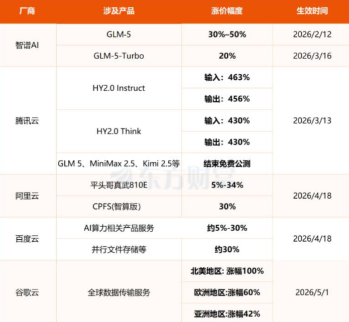 成本压力最终传导至云服务层。2026年3月,阿里云、百度智能云接连宣布涨价,阿里云AI算力、存储等产品最高涨价34%。此前,亚马逊AWS已在2026年1月将EC2机器学习容量块价格上调约15%,谷歌云在北美地区的特定网络服务价格直接翻番。