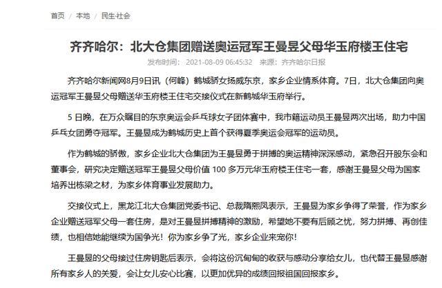 为此,齐齐哈尔本土企业北大仓集团特意赠予其父母一套价值超百万元的住房,以此表达对冠军的支持。